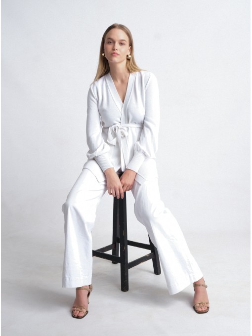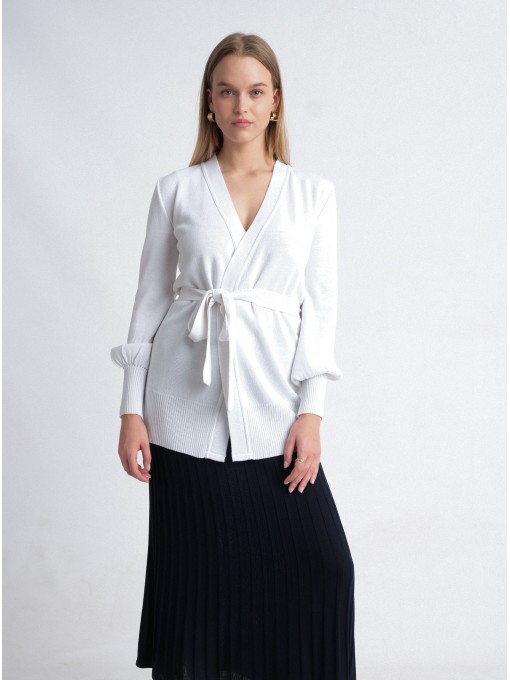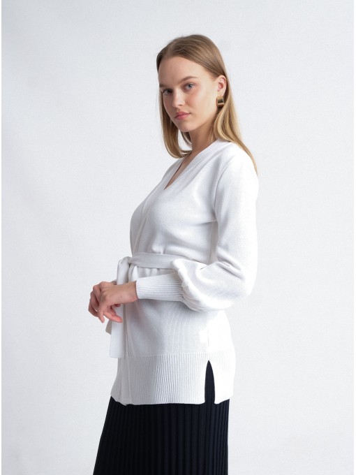 The Bilme wrap cardigan, knitted from merino wool yarn, is extra soft and cozy. Perfect for wearing on special occasions as well as during leisure time.